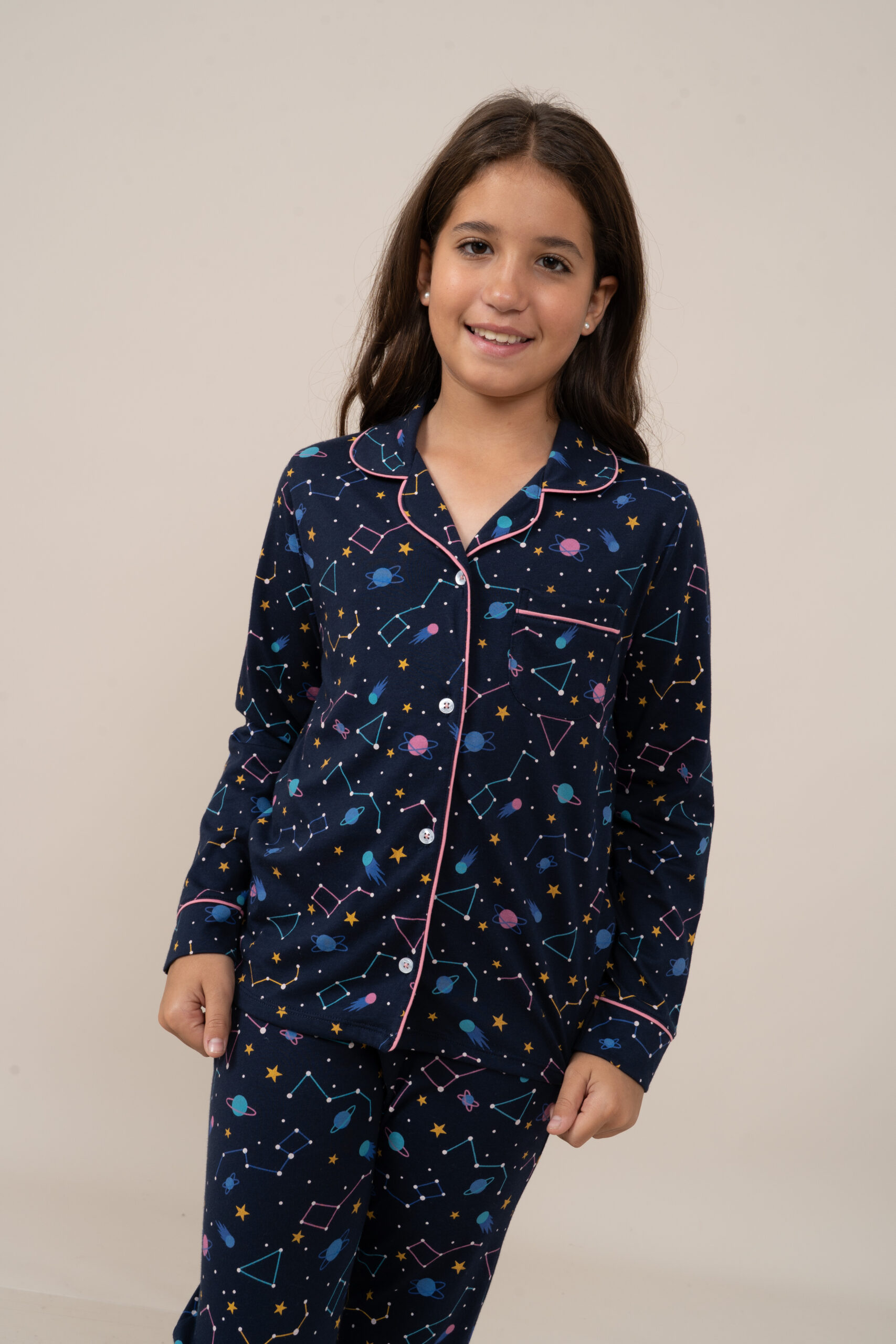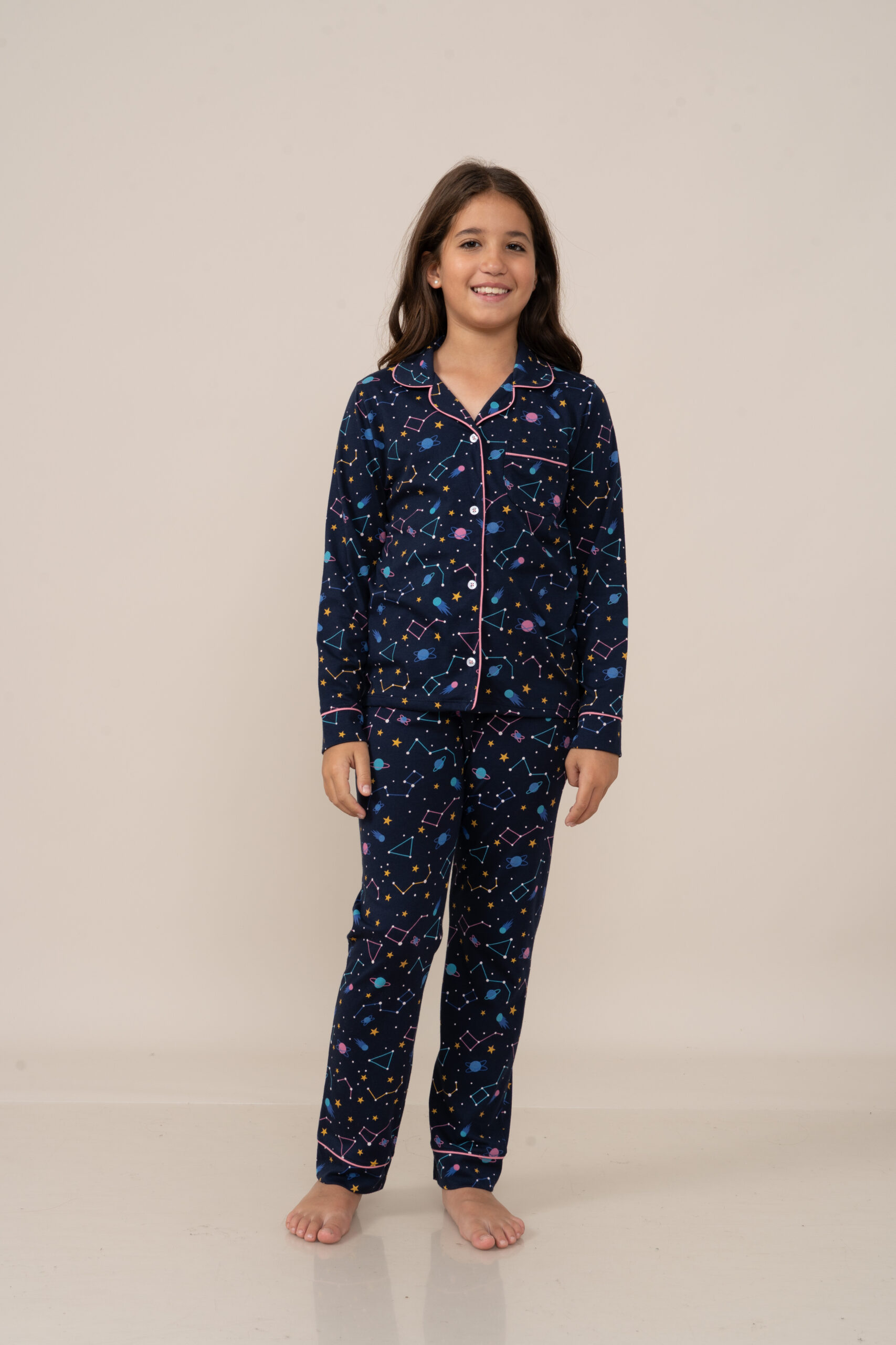 | PJ. Set. Chaqueta Pantalon 100% Algodón Pima Peruano, con un ligero y colorido estampado de constelacion. Esta pijama la encuentras tambien en nuestra categoria juvenil. |