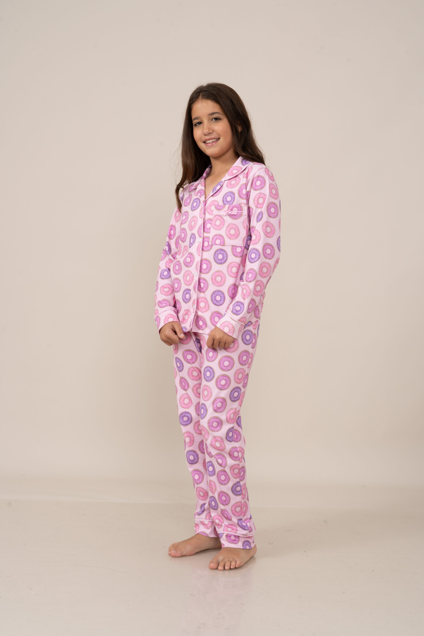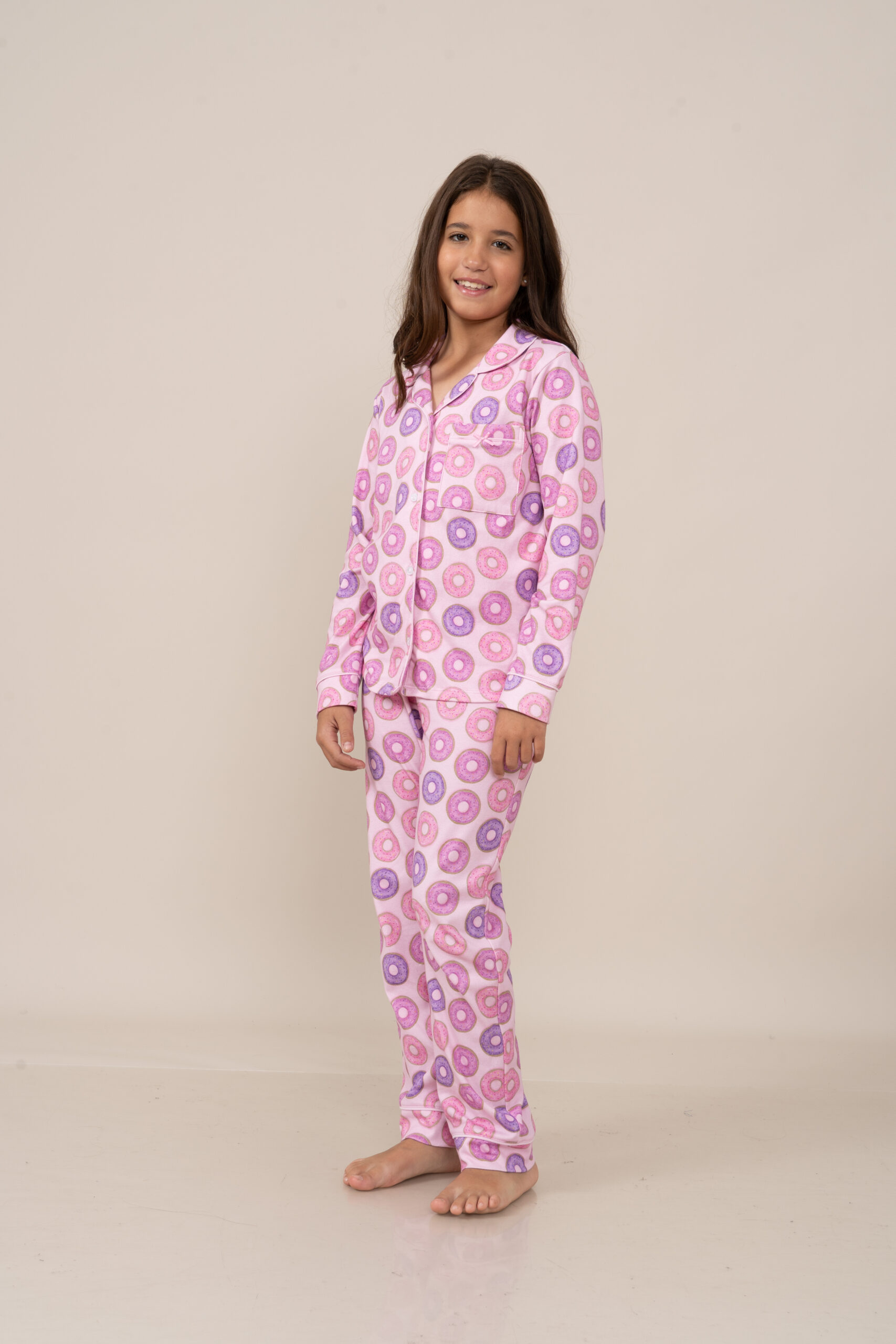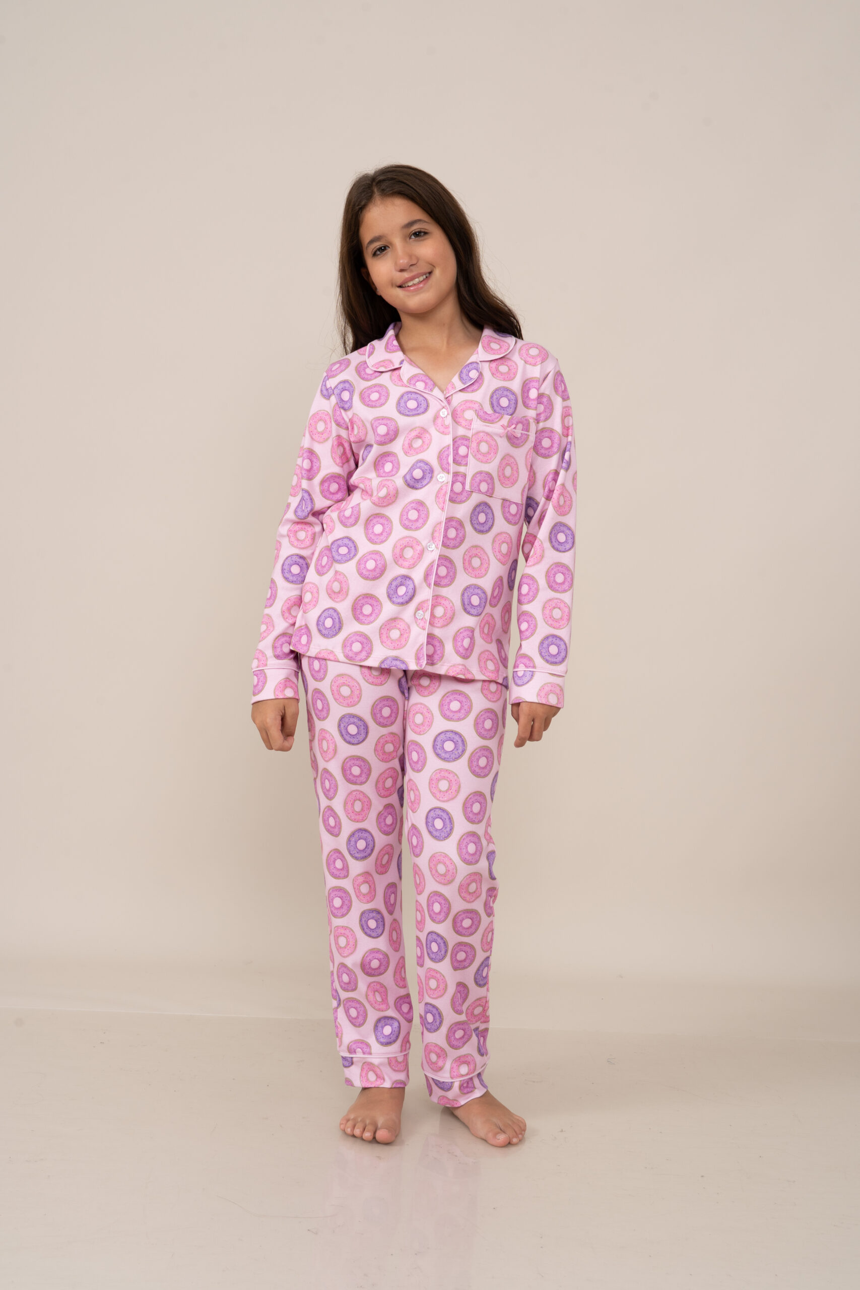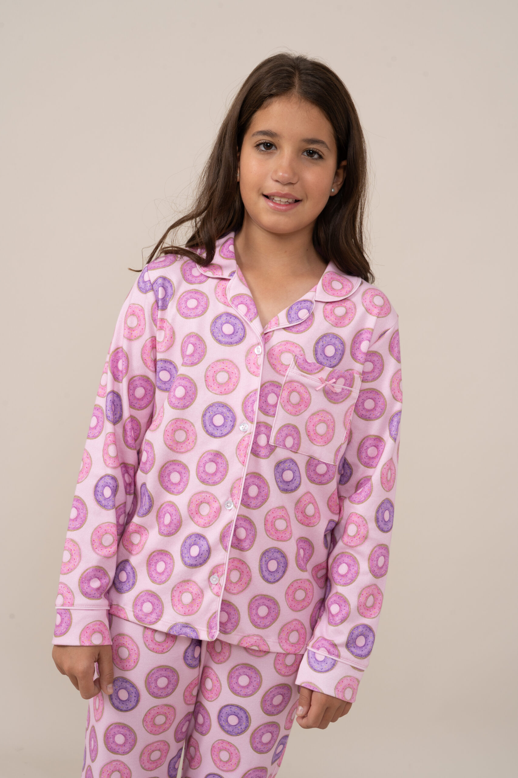 | Interlock 100% Algodón Peruano con un divertido estampado de donnuts. Esta tela esta perchada por dentro, haciendola mas abrigadora y a la vez cuenta con un ligero esmerilado por fuera para asegurar maxima suavidad |