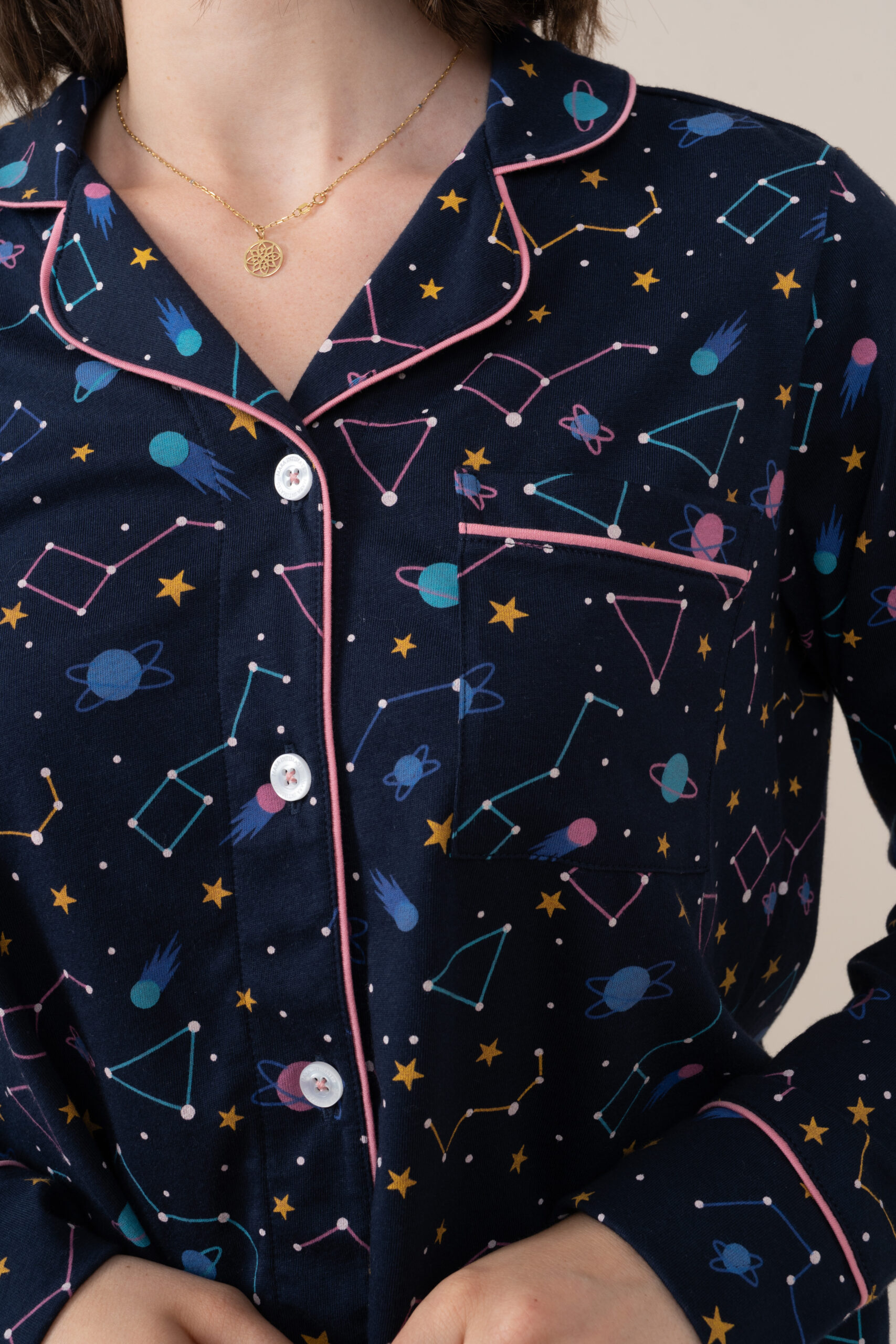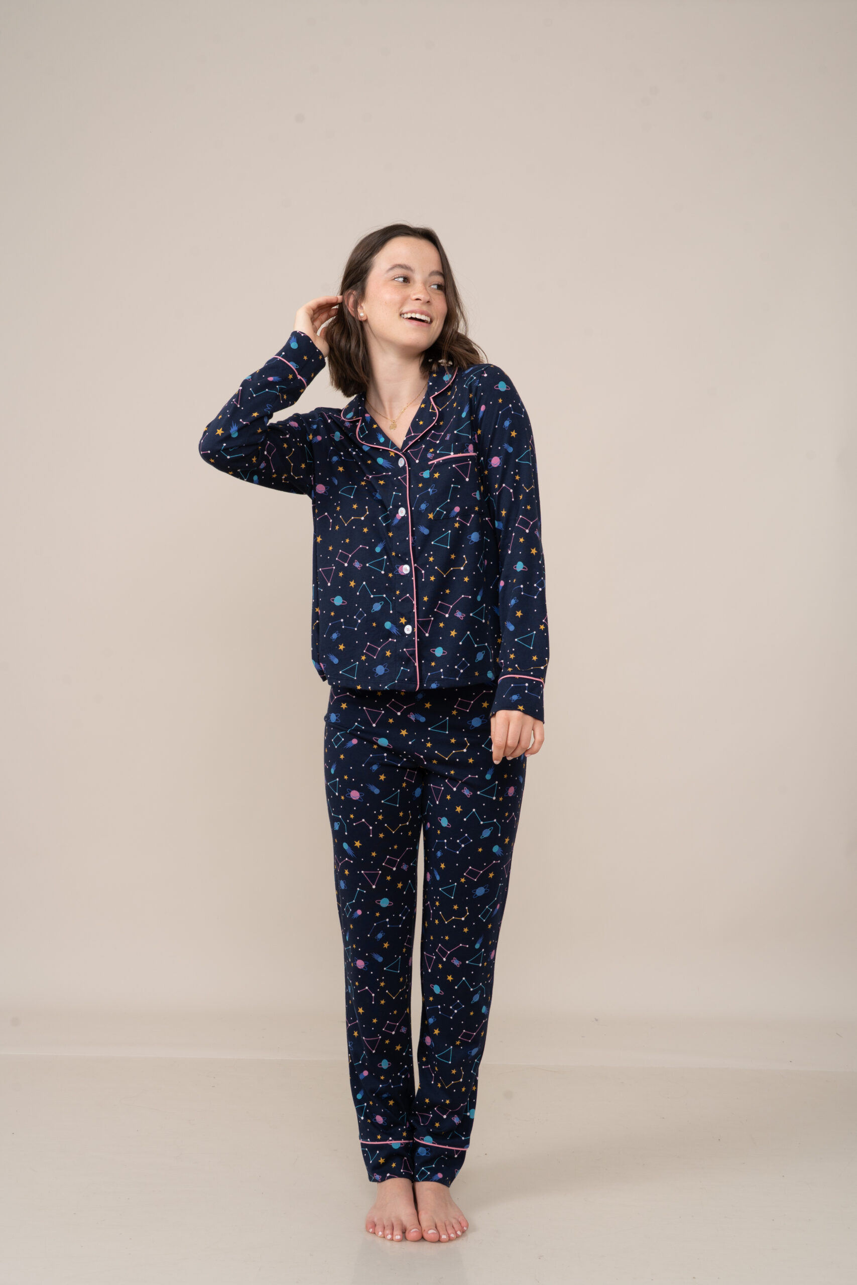| PJ. Set. Chaqueta Pantalon 100% Algodón Pima Peruano, con un ligero y colorido estampado de constelacion. Esta pijama la encuentras tambien en nuestra categoria de niñas |