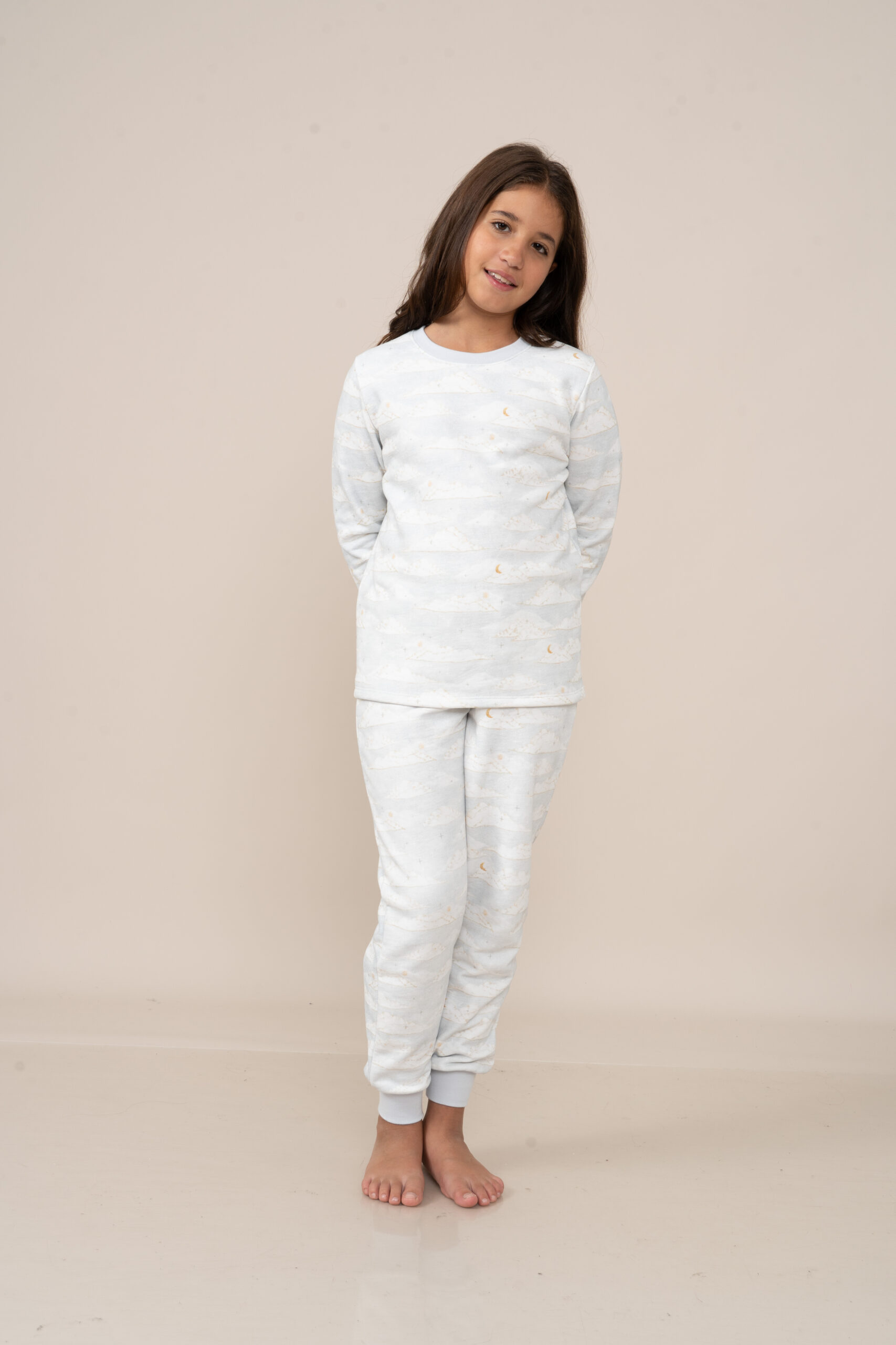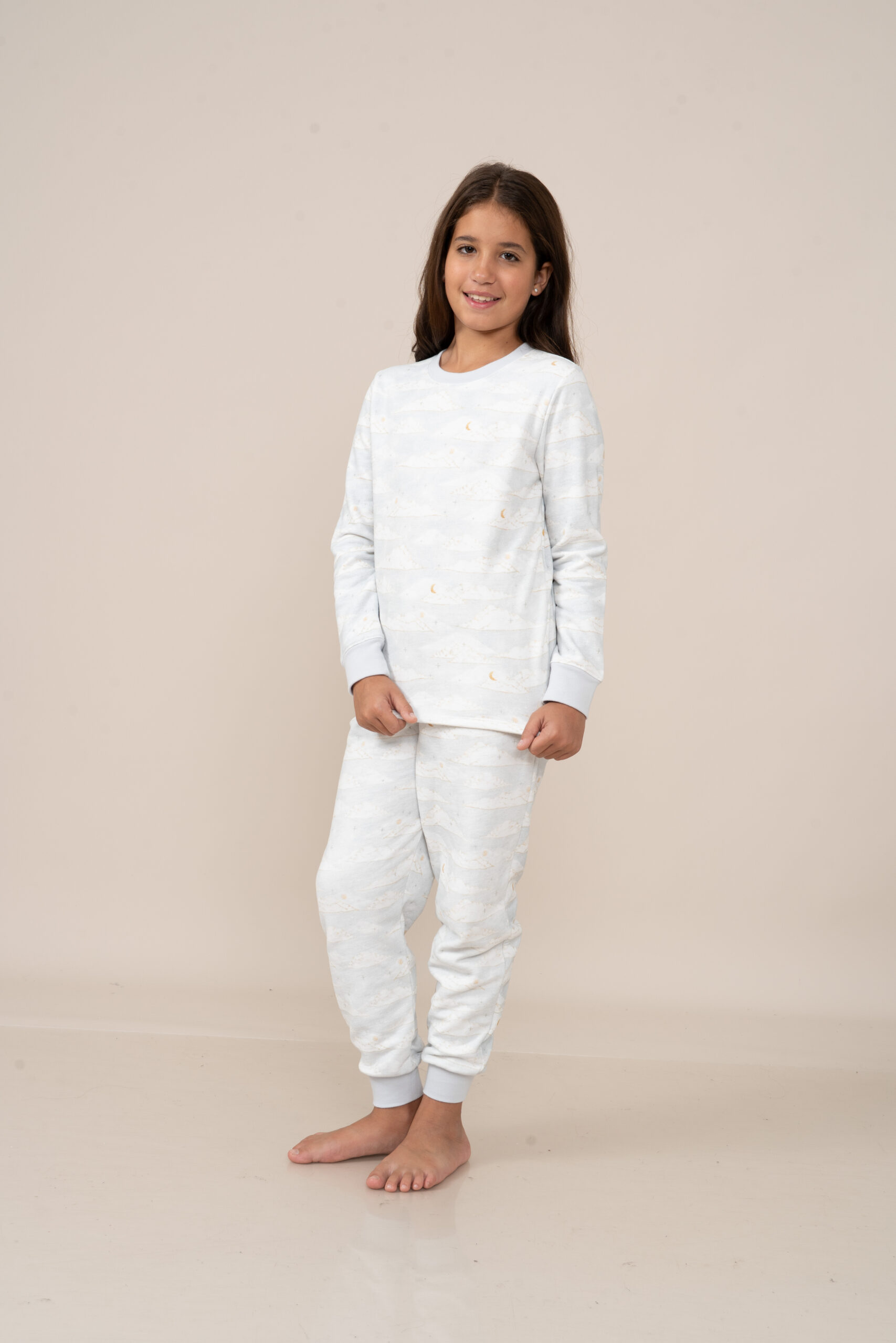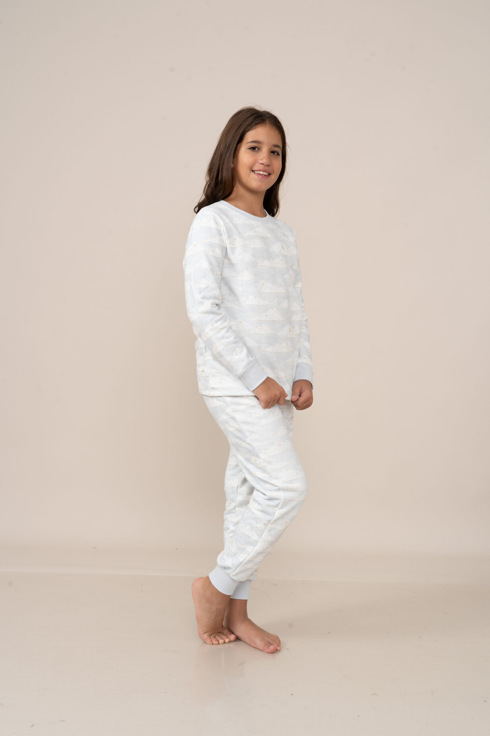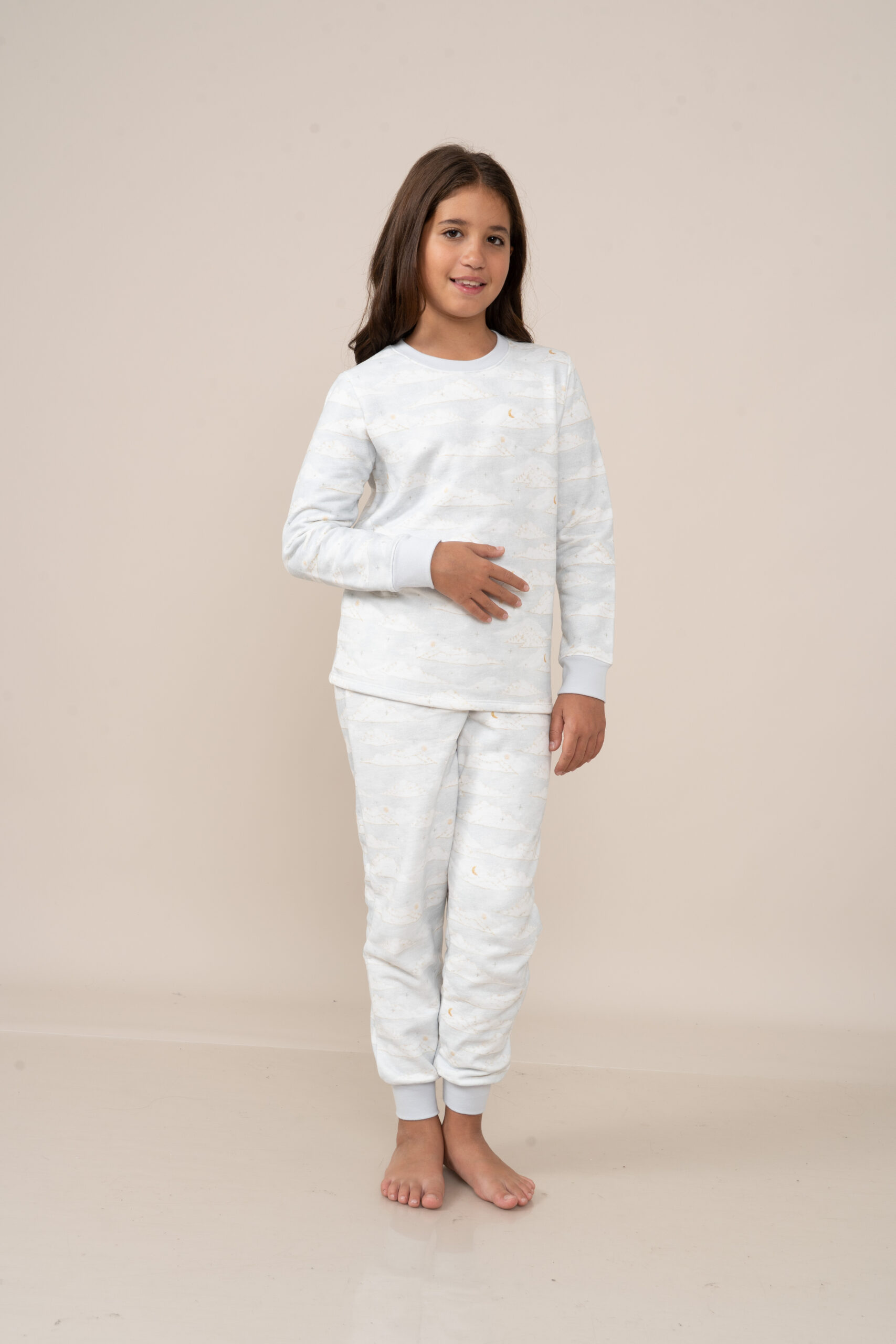 Franela 100% Algodón Peruano con un divertido estampado de nubes en tecnica digital. Esta tela esta perchada por dentro, haciendola mas abrigadora y a la vez cuenta con un ligero esmerilado por fuera para asegurar máxima suavidad